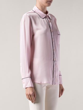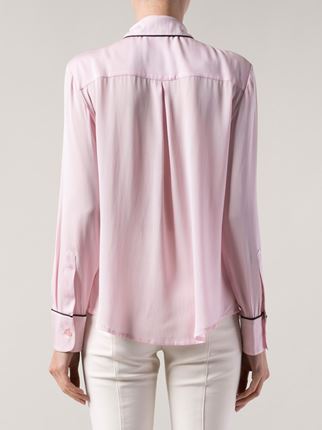 Bermuda pink and NYC black silk blend 'Isabella' blouse from Piamita featuring a classic collar, front full button down fastening, and single chest patch pocket. Has piped trimming throughout, back center inverted pleat, and long sleeves with buttoned cuffs.