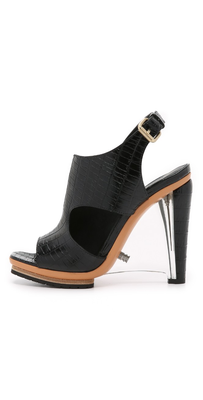 Edgy Rodarte peep-toe wedges with a stacked, textured platform and clear lucite panel. Buckled slingback strap. Covered heel. Lug sole. Never worn. Size 39. MSRP 1200$