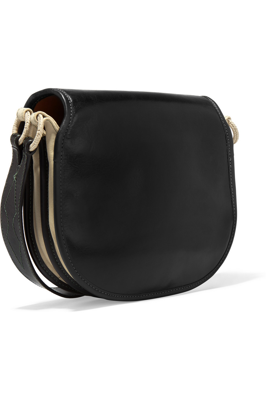 Claret and mustard leather panels, light green stitching, designer tag, gold hardware