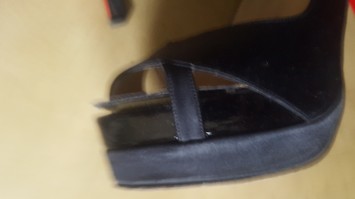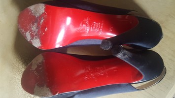 Christian Louboutin, preowned with lots of life left. These gorgeous shoes are satin platform peep toes with light scuffs on soles and small stain at bottom of heel. Please see photos for damage.