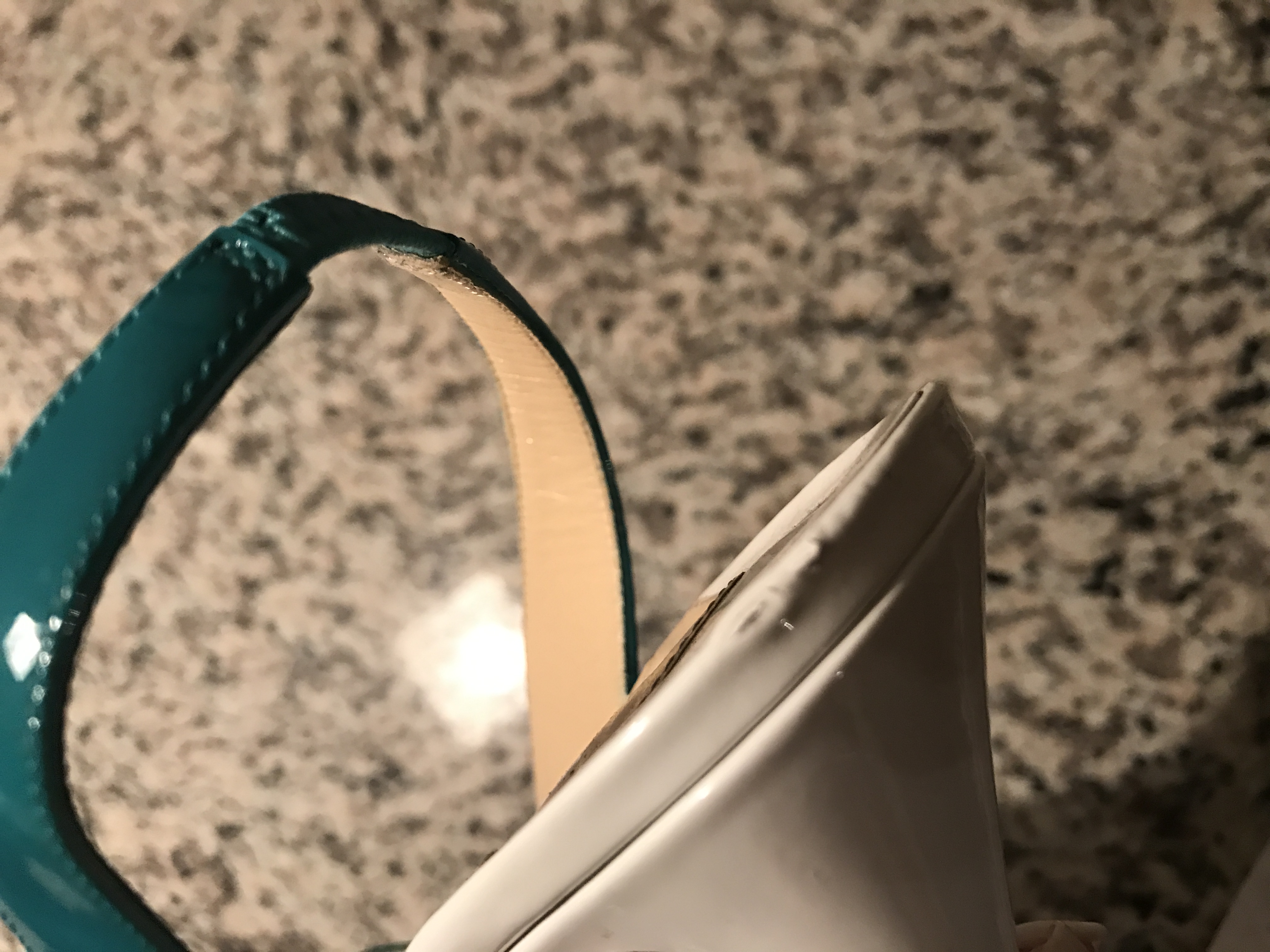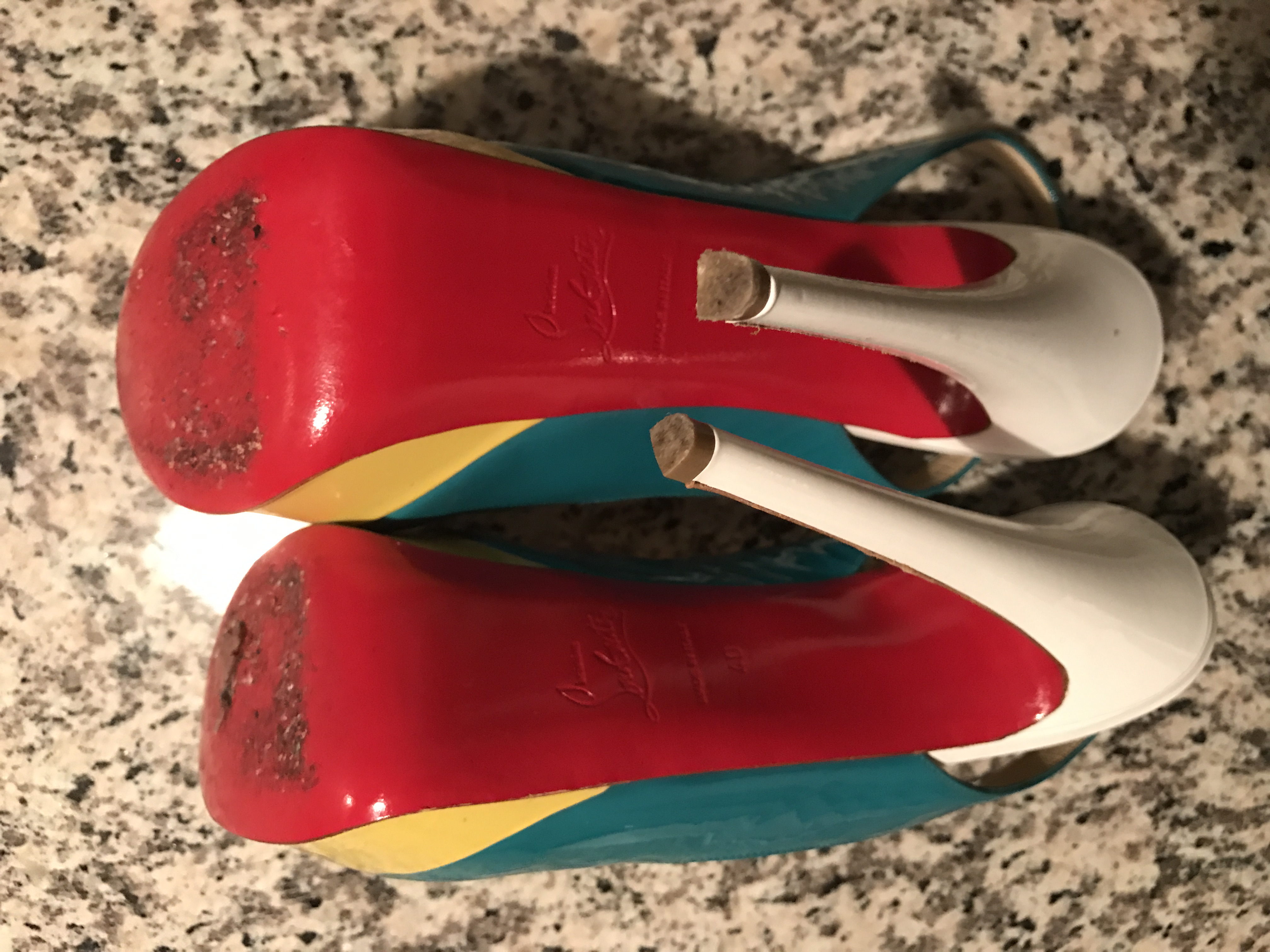 The soles have light wear. The uppers are clean and beautiful, but along the white patent leather there is some peeling, otherwise the shoes are still in excellent condition. No dust bag or box. Size 40