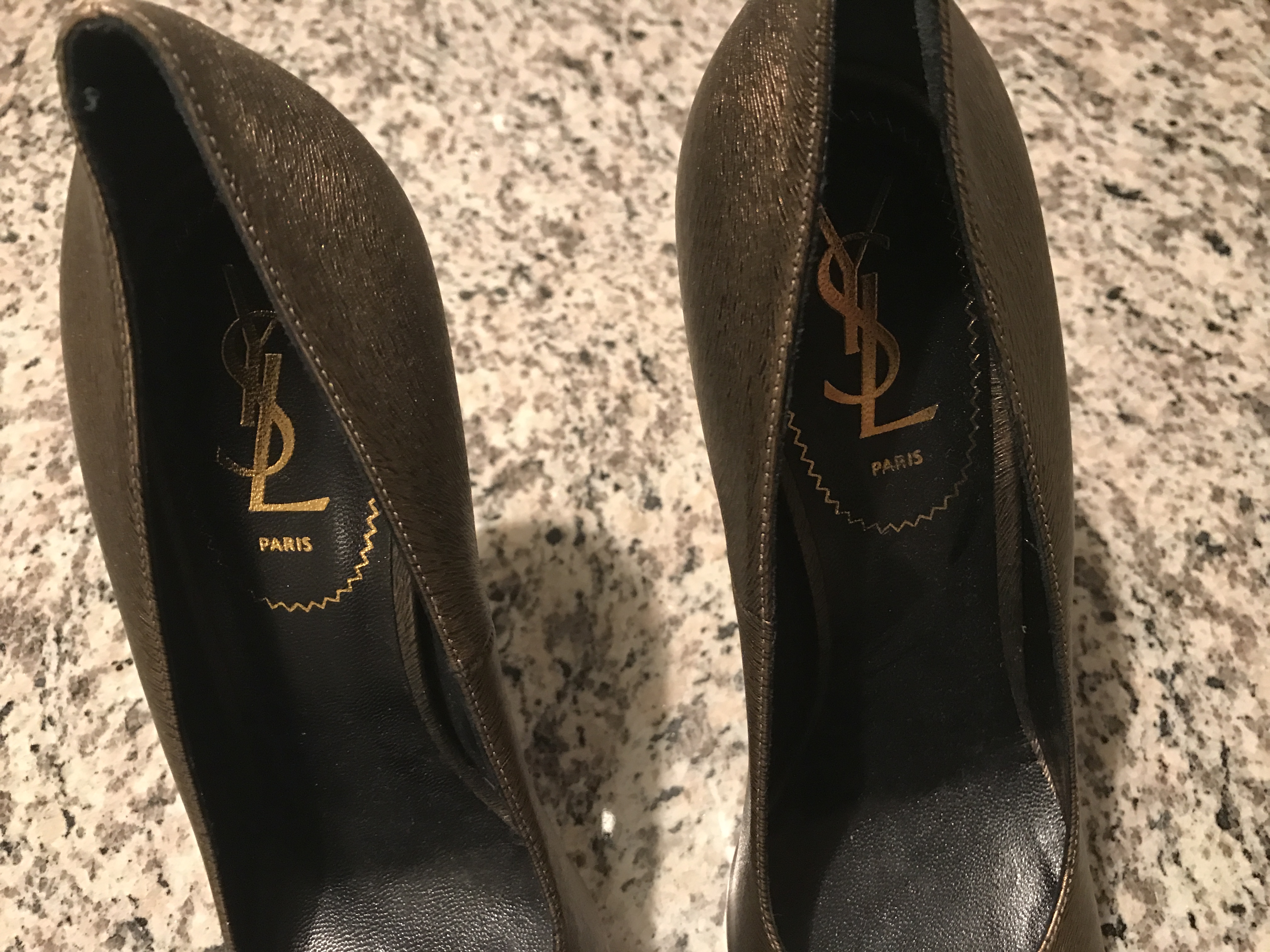 Heel measures approximately 150mm/ 6 inches with a 40mm/ 1.5 inch concealed platform. Elegantly proportioned and delicately hued, Yves Saint Laurent's Metallic bronze leather 'Tribtoo' pumps are headed straight to the top of our wish list. Choose this gravity-defying pair to give your after-dark wardrobe an instant lift. Size 39.5, pre-owned with general signs of use. Ships without box or dust bag.