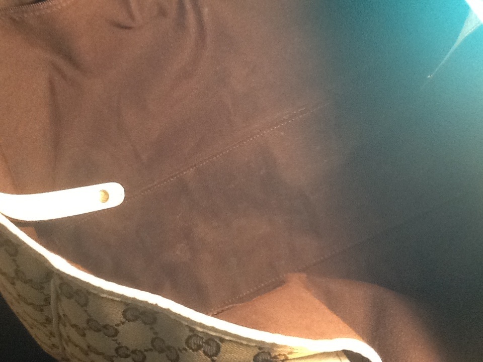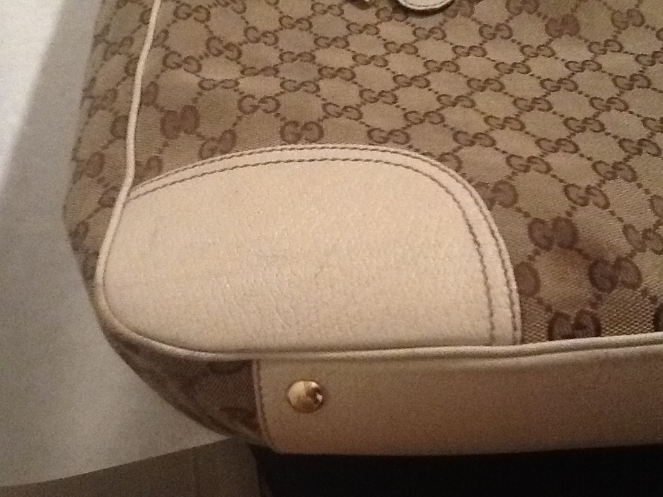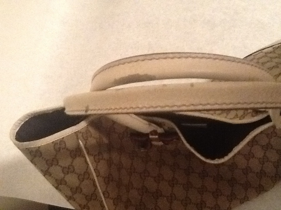 Gucci Mayfair tote in used condition. Signs of wear on leather as well as canvas. Pen marks on bottom of tote and signs of use/stains on interior canvas.