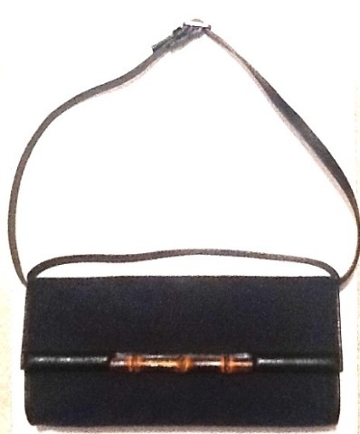 Black monogram gucci bamboo clutch. Straps can be removed. Signs of wear at top of bag. Otherwise pristine condition.