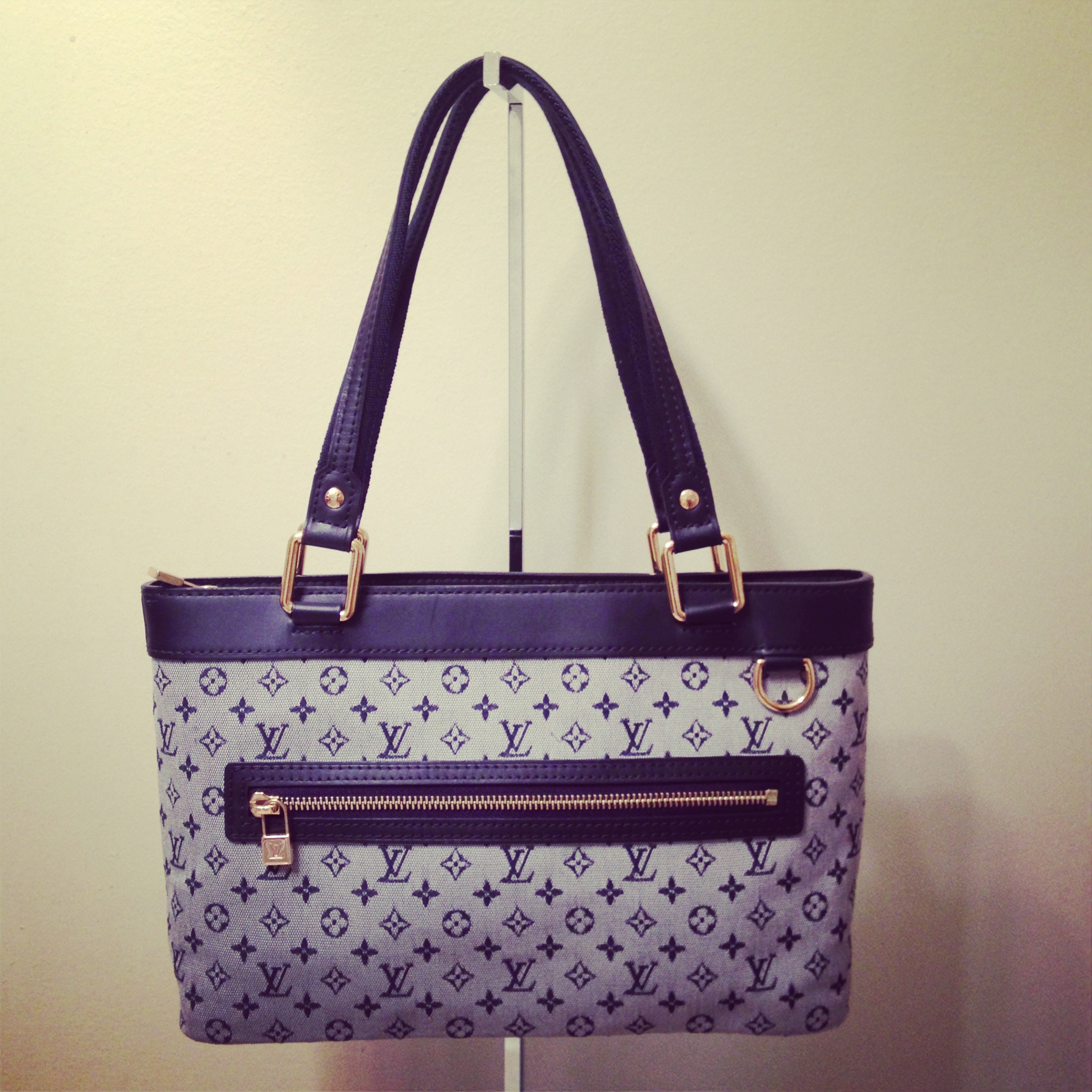 Stunning Louis Vuitton mini lin lucille. Limited edition light blue and navy canvas. Features gold hardware. Minor signs of wear inside from pen marks as seen in photos. Exterior is in pristine condition. Authenticity code inside reads SR1023.