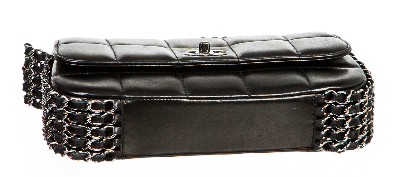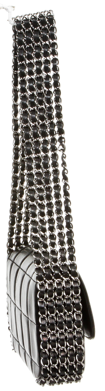 Limited edition and highly collectible, this amazing runway bag by Chanel features five chains all around for an edge like no other! Soft, subtle lambskin with silver hardware this chocolate bar style bag is one of 50 sold in the United States (according to the sa).