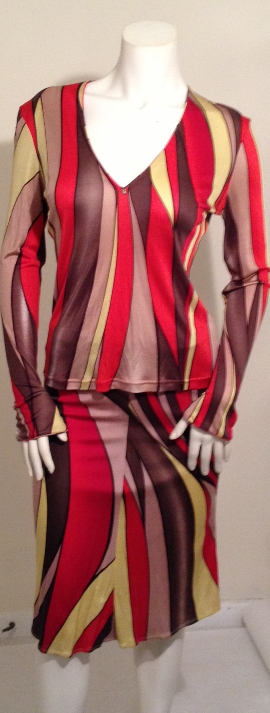 Vintage Gianni Versace two piece top with matching skirt. Vertical stripes create a flattering illusion of a tall lean body. Worn once. Pristine condition. Medusa detail at bust with crystal buttons at wrist to be worn open or closed. Size 8.