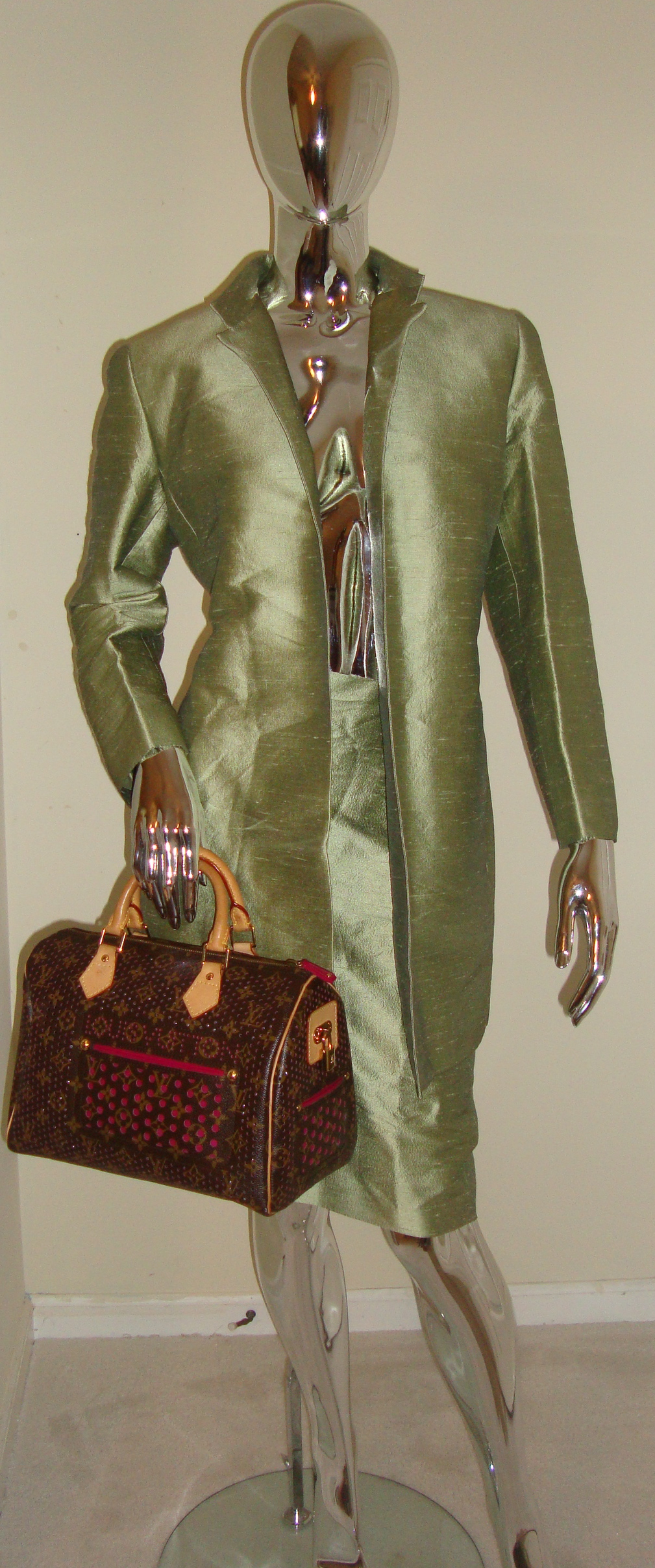 This stunning green suit by Ellen Tracy is sure to turn heads! An amazing open jacket with matching skirt. It comes new with tags and the jacket alone retails for $395. Size 10.