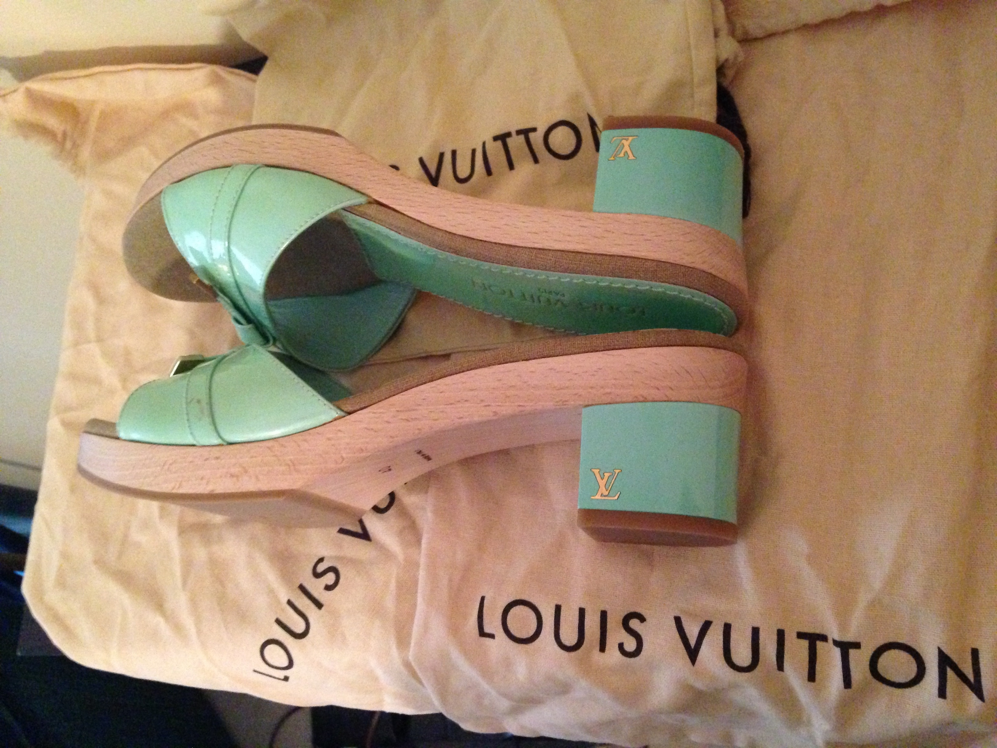 Perfect for the summer. These mint heels by Louis Vuitton are great for days at the pool and brunches! These are never worn and come with dust bags. Size 40=US 10.