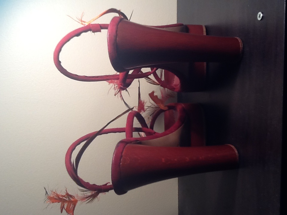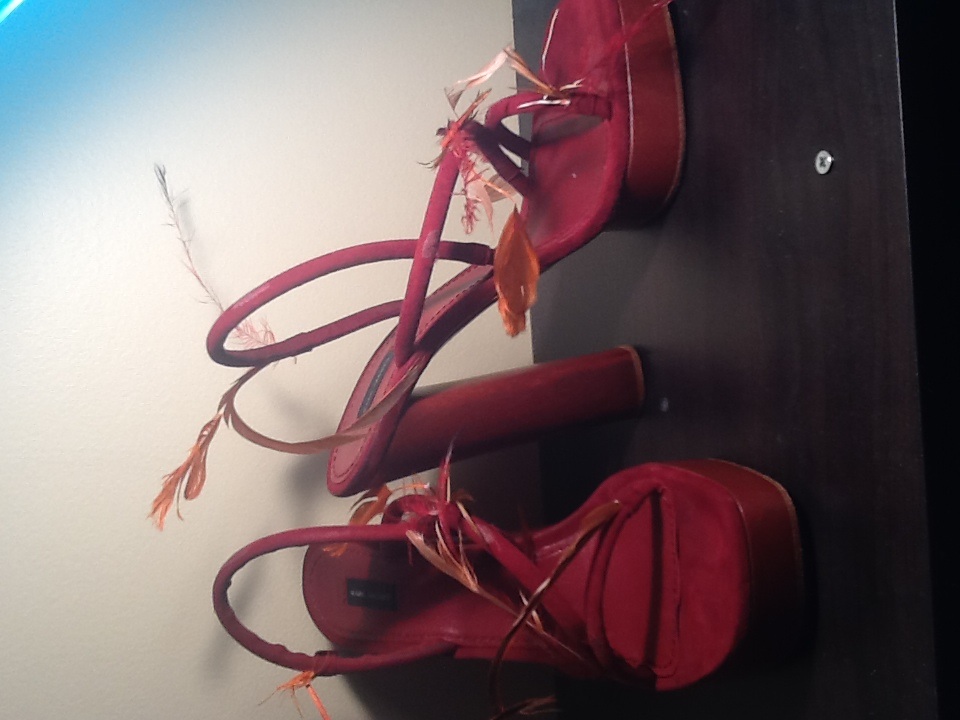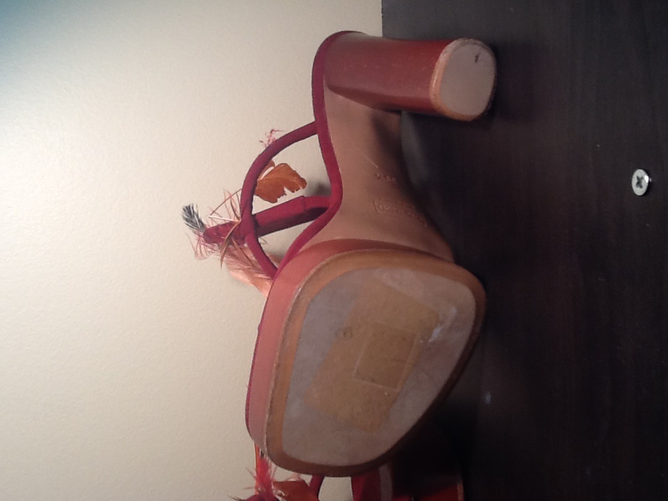 It appears that a few feathers are missing so it will take a creative buyer to fix them prior to wearing. They are sold as is, and are pre owned. They are marked 39.5 but fit more like an 8/8.5.