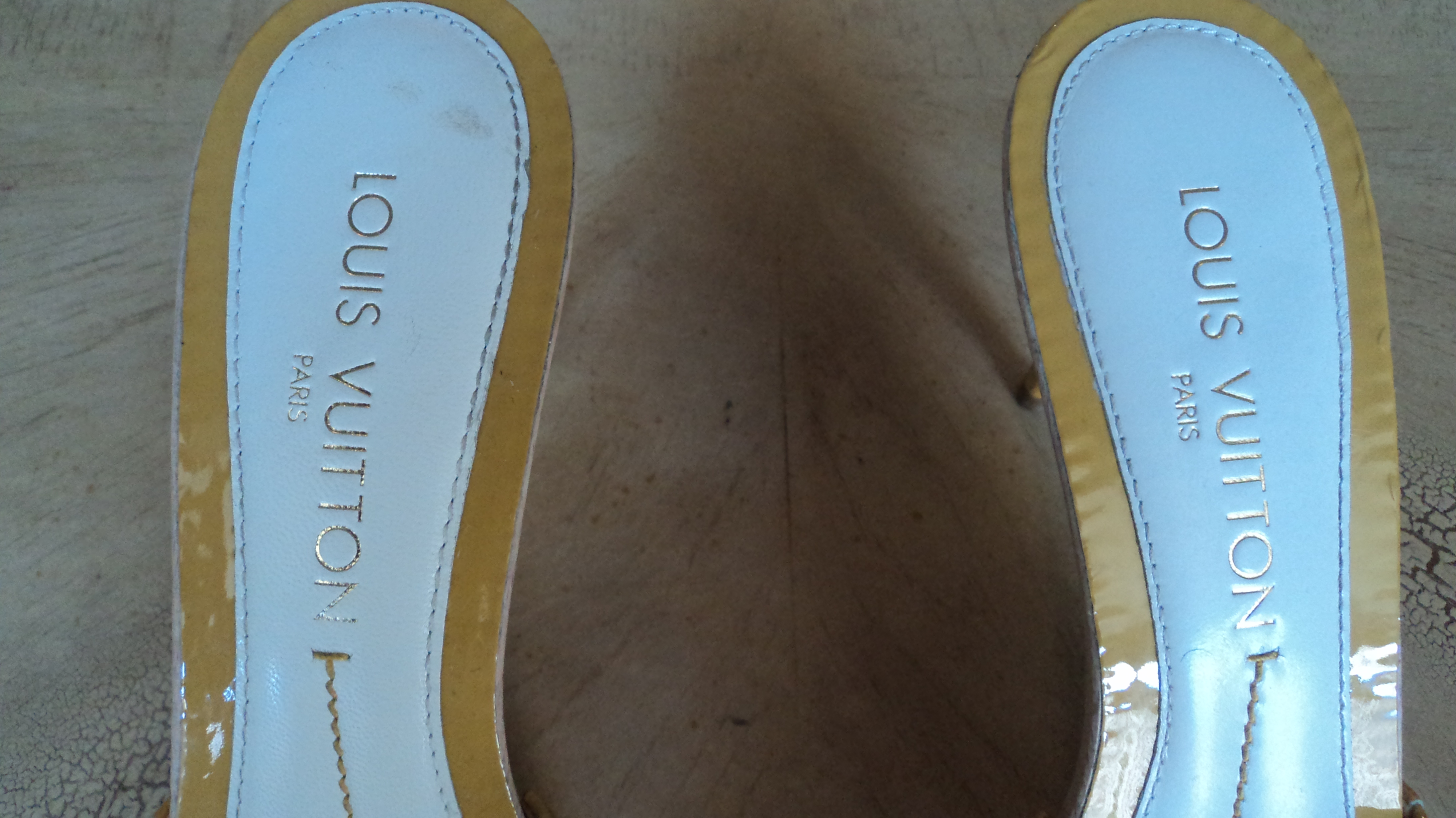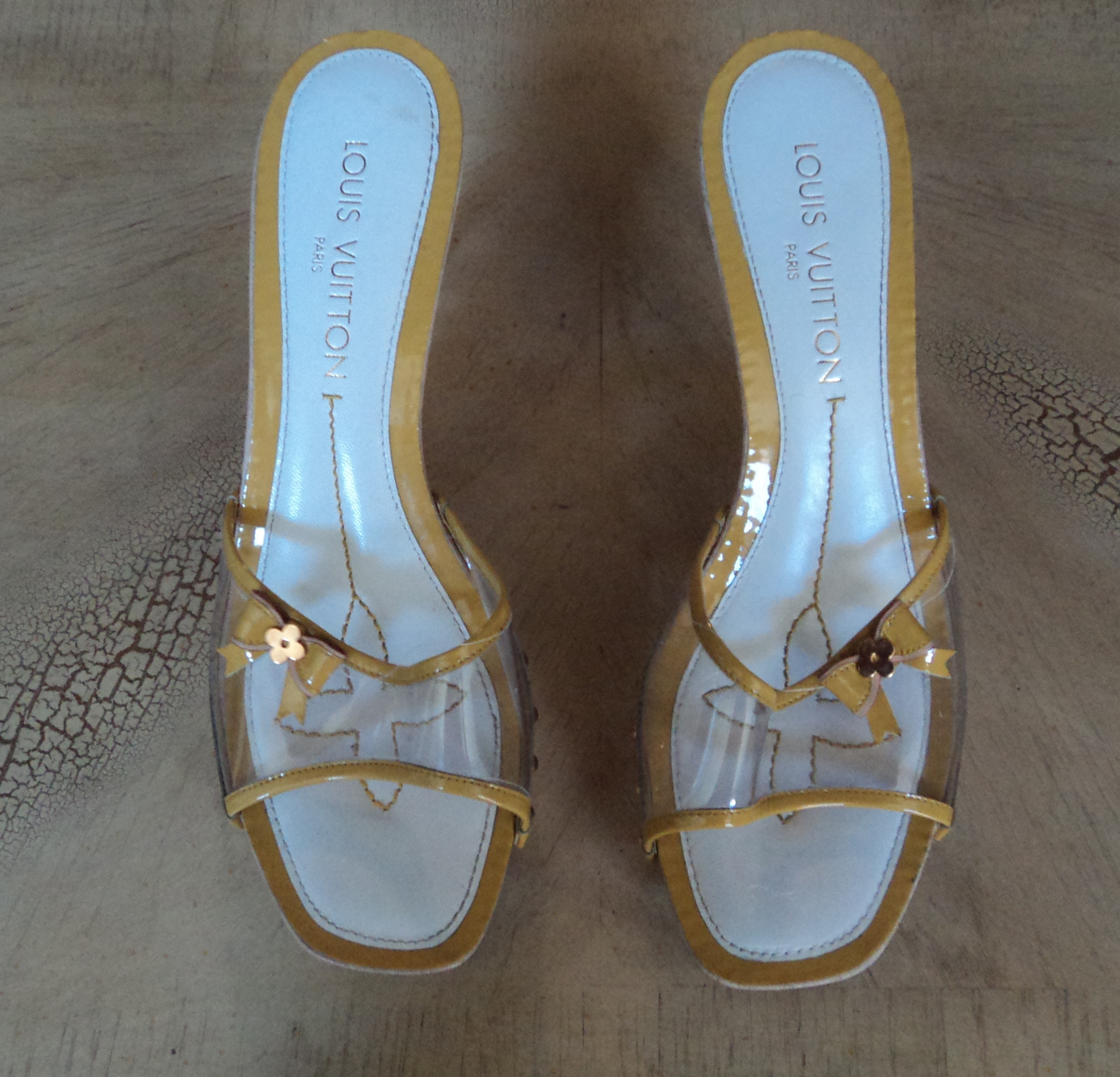 Marked a size 40 but fits more like an 8.5/8 these limited edition Louis Vuitton sandals are perfect for spring/summer. Insole measures appx. 10" the heel is appx. 4". Pre-owned with slight signs of wear.